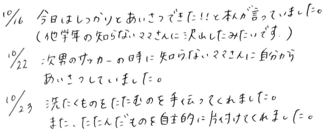 10/22 次男のサッカーの時に、知らないママさんに自分からあいさつしていました。