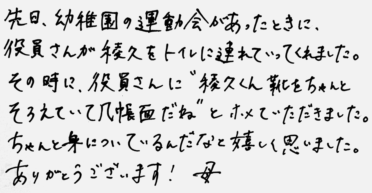 先日、幼稚園の運動会があったときに、役員さんが稜久をトイレに連れていってくれました。その時に、役員さんに、「稜久くん、靴をちゃんとそろえていて几帳面だね」とホメていただきました。ちゃんと身についているんだなと嬉しく思いました。ありがとうございます。母