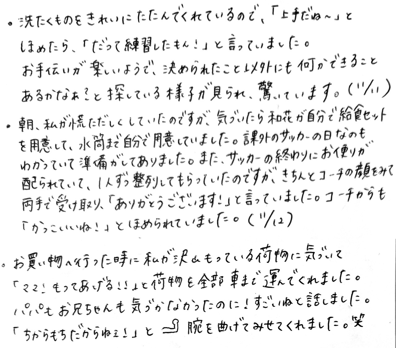 ・朝、私が慌ただしくしていたのですが、気づいたら和花が自分で給食セットを用意して、水筒まで自分で用意していました。課外のサッカーの日なのもわかっていて準備がしてありました。また、サッカーの終わりにお便りが配られていて、1人ずつ整列してもらっていたのですが、きちんとコーチの顔を見て両手で受け取り、「ありがとうございます!」と言っていました。コーチからも「かっこいいね!」と褒められていました。(11/12)