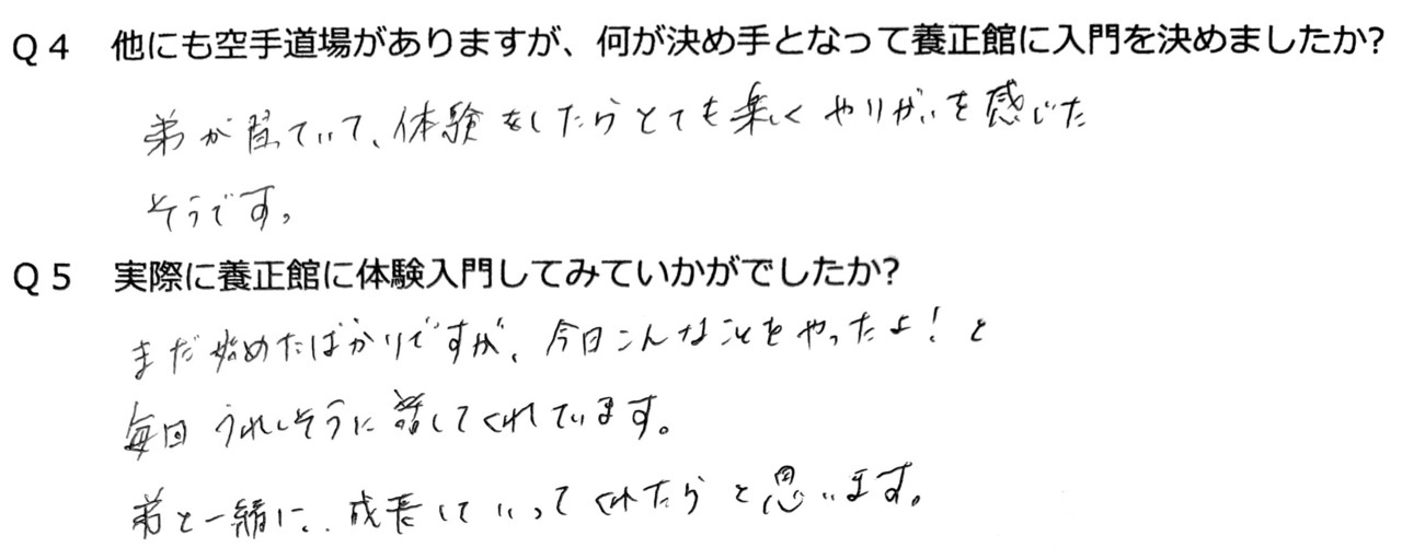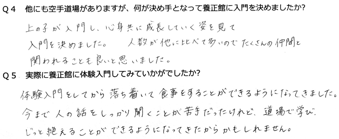 Q4 他にも空手道場がありますが、何が決め手となって養正館に入門を決めましたか?