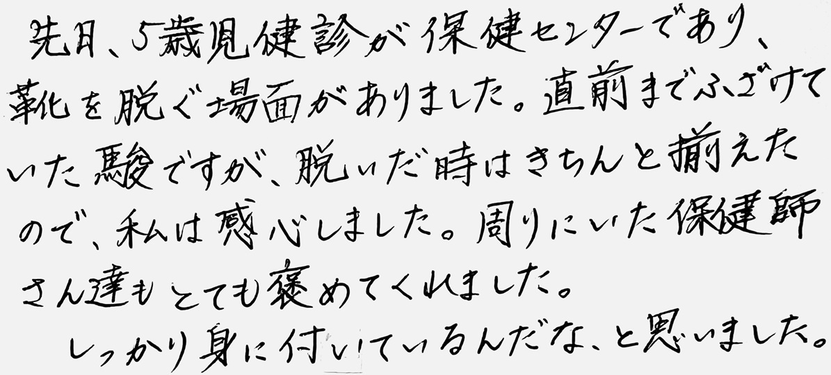 先月、5歳児健診が保健センターであり、靴を脱ぐ場面がありました。直前までふざけていた駿ですが、脱いだ時はきちんと揃えたので、私は感心しました。周りにいた保健師さん達もとても褒めてくれました。しっかり身に付いているんだな、と思いました。